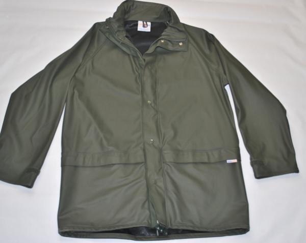 Waterproof stretchable pu tricot fabric with zip front and studded strom flap. Concealed hood in collar and velcro adjustable cuffs with large velcro pockets.
