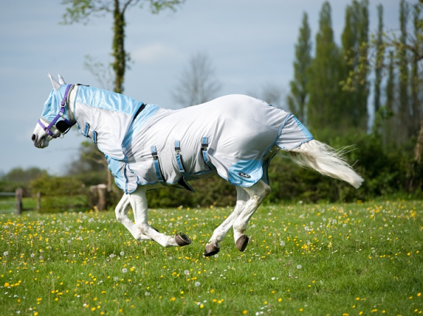 Further InformationBreathable tight weave mesh outerStretchable lycra neck insert and elasticated detachable leg straps for ultimate comfortBelly flap and large tail flapIncludes fly maskSand/Blue colour