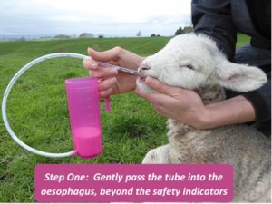 The tube safety marks indicate when you have passed the tube a safe distance past the airway entrance in a lamb or kid up to 6kg. When the printing cannot be seen outside the animal’s mouth you are far enough. Consider this distance a minimum as it is safer to pass the tube further than not far enough – yet it is unnecessary to pass the tube all the way to the stomach.